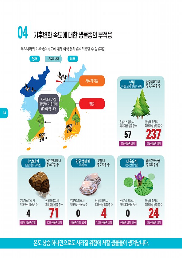 우리나라의 기온상승 속도에 대해 야생 동식물은 적응할 수 있을까? 04 기후변화 속도에 대한 생물종의 부적응 현재 미래 자신에게 가장 잘 맞는 기후대에 살아야 합니다. 멸종 서식지 이동 온도 상승 하나만으로도 사라질 위험에 처할 생물들이 생겨납니다. 14 기후대 변화 갯벌 내 총 270종 중 온실가스 감축 시 피해 예상 생물 종 수 연안생태계 무척추 현 상태 유지 시 피해 예상 생물 종 수 0 4 생물종 위험 없음 1.5% 생물종 위험 담수생태계 내 총 697종 중 온실가스 감축 시 피해 예상 생물 종 수 수생태계 민물어류, 무척추 현 상태 유지 시 피해 예상 생물 종 수 4 71 0.5% 생물종 위험 10% 생물종 위험 산림생태계 내 총 4,744종 중 온실가스 감축 시 피해 예상 생물 종 수 산림 식물,...