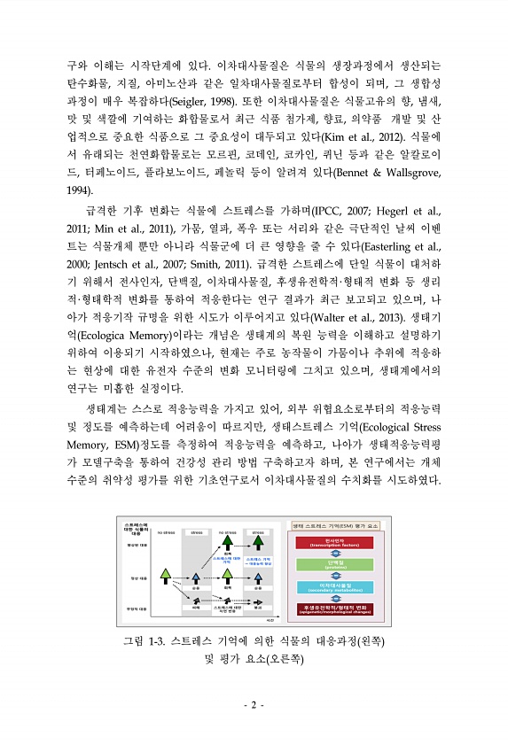 2 구와 이해는 시작단계에 있다. 이차대사물질은 식물의 생장과정에서 생산되는 탄수화물, 지질, 아미노산과 같은 일차대사물질로부터 합성이 되며, 그 생합성 과정이 매우 복잡하다 Seigler, 1998 또한 이차대사물질은 식물고유의 향, 냄새, 맛 및 색깔에 기여하는 화합물로서 최근 식품 첨가제, 향료, 의약품 개발 및 산 업적으로 중요한 식품으로 그 중요성이 대두되고 있다 Kim et al., 2012 식물에 서 유래되는 천연화합물로는 모르핀, 코데인, 코카인, 퀴닌 등과 같은 알칼로이 드, 터페노이드, 플라보노이드, 페놀릭 등이 알려져 있다 Bennet & Wallsgrove, 1994 급격한 기후 변화는 식물에 스트레스를 가하며 IPCC, 2007; Hegerl et al., 2011; Min et al...
