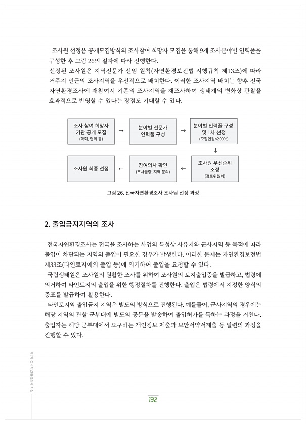 132 제5차 전국자연환경조사 지침 조사원?선정은?공개모집방식의?조사참여?희망자?모집을?통해 ?개?조사분야별?인력풀을 구성한?후?그림 ??의?절차에?따라?진행한다. 선정된?조사원은?지역전문가?선임?원칙 자연환경보전법?시행규칙?제??조 에?따라 거주지?인근의?조사지역을?우선적으로?배치한다. 이러한?조사지역?배치는?향후?전국 자연환경조사에?재참여시?기존의?조사지역을?재조사하여?생태계의?변화상?관찰을 효과적으로?반영할?수?있다는?장점도?기대할?수?있다. 조사?참여?희망자 기관?공개?모집 학회, 협회?등 → 분야별?전문가 인력풀?구성 분야별?인력풀?구성 및 1차?선정 모집인원 200% → → 조사원?우선순위 조정 검토위원회 → 참여의사?확인 조사원?최종?선정 → 조사물량, 지역?문의 그림 26. 전국자연환경조사?조...