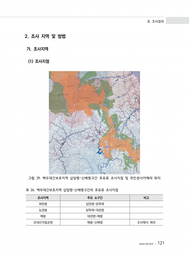Ⅱ. 조사결과 www.nie.re.kr ? 121 2. 조사 지역 및 방법 가. 조사지역 1 조사지점 그림 39. 백두대간보호지역 삽당령신배령구간 포유류 조사지점 및 무인센서카메라 위치 조사지역 주요 소구간 비고 화란봉 삽당령닭목재 능경봉 닭목재대관령 매봉 대관령매봉 오대산국립공원 매봉신배령 조사에서 제외 표 26. 백두대간보호지역 삽답령신배령구간의 포유류조사지점