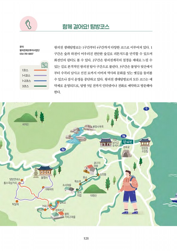 128 함께 걸어요! 탐방코스 왕피천 생태탐방로는 1구간부터 4구간까지 다양한 코스로 이루어져 있다. 1 구간은 숲과 하천이 어우러진 편안한 숲길로 피톤치드를 만끽할 수 있으며 화전민의 쉼터도 볼 수 있다. 2구간은 왕피천계곡의 절경을 제대로 느낄 수 있는 길로 본격적인 왕피천 탐사 구간으로 불린다. 3구간은 불영사 뒷산에서 부터 수곡리 남사고 선친 묘까지 이어져 역사와 문화를 잇는 옛길을 둘러볼 수 있으나 잠시 운영을 중단하고 있다. 왕피천 생태탐방로의 모든 코스는 예 약제로 운영되므로, 탐방 5일 전까지 인터넷이나 전화로 예약하고 방문해야 한다. 1코스 1-1코스 1-2코스 3코스 문의 왕피천에코투어사업단054-781-8897