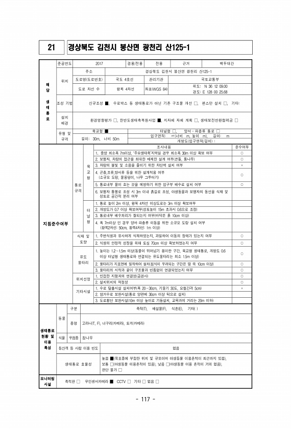 117 21 경상북도 김천시 봉산면 광천리 산125-1 해 당 생 태 통 로 준공연도 2017 겸용/전용 전용 근거 백두대간 위치 주소 경상북도 김천시 봉산면 광천리 산125-1 도로명 도로번호 국도 4호선 관리기관 국토교통부 도로 차선 수 왕복 4차선 좌표 WGS 84 위도N 36 12 09.00 경도E 128 00 25.68 조성 기법 신규조성 ■, 수로박스 등 생태통로가 아닌 기존 구조물 개선 □, 펜스만 설치 □, 기타설치 배경 환경영향평가 □, 한반도생태축복원사업 ■, 지자체 자체 계획 □, 생태보전반환협력금 □ 유형 및 규격 육교형 ■ 터널형 □, 양서?파충류 통로 □ 길이30m, 너비 50m 입구면적㎡ 너비 m, 높이 m , 길이m 개방도 입구면적/길이 지침준수여부 통로 규격 육 교 형 조사내용...