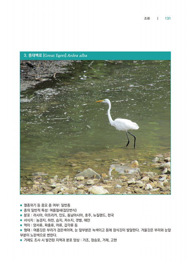 조류 ┃ 131 3. 중대백로 [Great Egret] Ardea alba ■ 멸종위기 등 중요 종 여부일반종 ■ 종의 일반적 특성여름철새 집단번식 ■ 분포 러시아, 아프리카, 인도, 동남아시아, 호주, 뉴질랜드, 한국 ■ 서식지 농경지, 하천, 습지, 저수지, 갯벌, 해안 ■ 먹이 양서류, 파충류, 어류, 갑각류 등 ■ 형태 여름깃은 부리가 검은색이며, 눈 앞부분은 녹색이고 등에 장식깃이 발달한다. 겨울깃은 부리와 눈앞 부분이 노란색으로 변한다. ■ 거제도 조사 시 발견된 지역과 분포 양상 가조, 장승포, 거제,고현