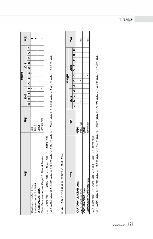 www ·nie·re·kr ? 121 학명 국명 조사년도 2013 2018 비고 a b c d A B C D E F G H Veratrum patulum Loes. 박새 * * Ⅰ Veratrum versicolor Nakai 흰여로 * Ⅰ ORCHIDACEAE Juss. 난초과 Platanthera ussuriensis Regel & Maack Maxim. 나도잠자리란 * Ⅱ a 성재산 일대, b 용양보 일대, c 대성산 일대, d 적근산 일대 A 도창리 코스, B 성재산 코스, C 대성산 코스, D 적근산 코스, E 산양리 코스, F 주파리 코스, G 고둔골 코스, H 비운이 코스 학명 국명 조사년도 2013 2018 비고 a b c d A B C D E F G H CARYOPHYLLACEAE Juss....