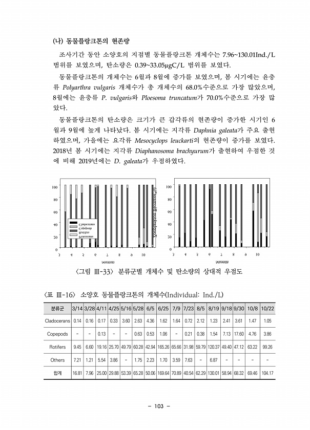 103 나 동물플랑크톤의 현존량 조사기간 동안 소양호의 지점별 동물플랑크톤 개체수는 7.96130.01Ind./L 범위를 보였으며, 탄소량은 0.3933.05?gC/L 범위를 보였다. 동물플랑크톤의 개체수는 6월과 8월에 증가를 보였으며, 봄 시기에는 윤충 류 Polyarthra vulgaris 개체수가 총 개체수의 68.0%수준으로 가장 많았으며, 8월에는 윤충류 P. vulgaris와 Ploesoma truncatum가 70.0%수준으로 가장 많 았다. 동물플랑크톤의 탄소량은 크기가 큰 갑각류의 현존량이 증가한 시기인 6 월과 9월에 높게 나타났다. 봄 시기에는 지각류 Daphnia galeata가 주요 출현 하였으며, 가을에는 요각류 Mesocyclops leuckarti의 현존량이 증가를 보였다. 2...