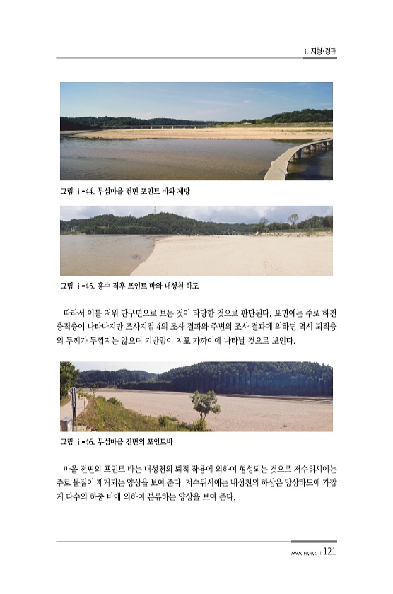 i. 지형·경관 www.nie.re.kr ?121 그림 ⅰ-44. 무섬마을 전면 포인트 바와 제방 그림 ⅰ-45. 홍수 직후 포인트 바와 내성천 하도 따라서 이를 저위 단구면으로 보는 것이 타당한 것으로 판단된다. 표면에는 주로 하천 충적층이 나타나지만 조사지점 4의 조사 결과와 주변의 조사 결과에 의하면 역시 퇴적층 의 두께가 두껍지는 않으며 기반암이 지표 가까이에 나타날 것으로 보인다. 그림 ⅰ-46. 무섬마을 전면의 포인트바 마을 전면의 포인트 바는 내성천의 퇴적 작용에 의하여 형성되는 것으로 저수위시에는 주로 물질이 제거되는 양상을 보여 준다. 저수위시에는 내성천의 하상은 망상하도에 가깝 게 다수의 하중 바에 의하여 분류하는 양상을 보여준다.