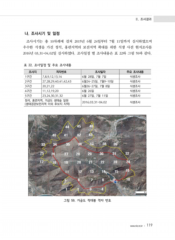 Ⅱ. 조사결과 www.nie.re.kr ? 119 나. 조사시기 및 일정 조사시기는 총 10차례에 걸쳐 2015년 6월 24일부터 7월 11일까지 실시하였으며 우수한 식생을 가진 청석, 홍련지역의 보전지역 확대를 위한 식생 사전 현지조사를 2016년 03.3104.02일 실시하였다. 조사일정 별 조사내용은 표 22와 그림 59과 같다. 조사지 격자번호 조사일자 주요 조사내용 1구간 7,8,9,12,13,14 6월 28일, 7월 7일 식생조사 2구간 27,28,29,40,41,42,43 6월2425일, 7월910일 식생조사 3구간 20,21,22 6월2627일, 7월 8일 식생조사 4구간 11,12,19,20 6월 26일 식생조사 5구간 23,24,30,31,32 6월 27일, 7월 11일 식생조사 청석, 홍...