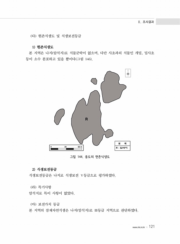 Ⅱ. 조사결과 www.nie.re.kr ? 121 다 현존식생도 및 식생보전등급 1 현존식생도 본 지역은 나지 암석지 로 식물군락이 없으며, 다만 사초과의 식물인 개밀, 밀사초 등이 소수 분포하고 있을 뿐이다 그림 146 그림 144. 웅도의 현존식생도 2 식생보전등급 식생보전등급은 나지로 식생보전 Ⅴ등급으로 평가하였다. 라 특기사항 암석지로 특이 사항이 없었다. 마 보전가치 등급 본 지역의 잠재자연식생은 나지 암석지 로 Ⅲ등급 지역으로판단하였다.