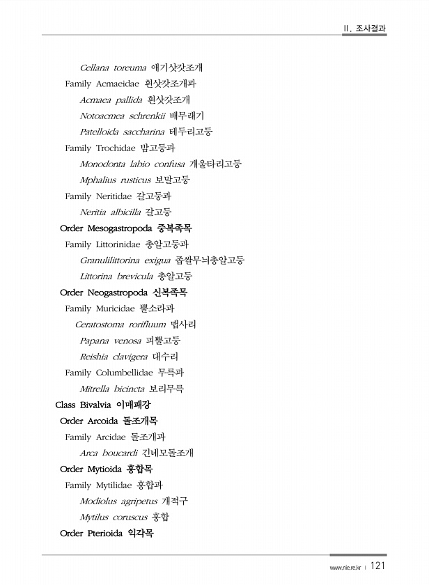 Ⅱ. 조사결과 www.nie.re.kr ? 121 Cellana toreuma 애기삿갓조개 Family Acmaeidae 흰삿갓조개과 Acmaea pallida 흰삿갓조개 Notoacmea schrenkii 배무래기 Patelloida saccharina 테두리고둥 Family Trochidae 밤고둥과 Monodonta labio confusa 개울타리고둥 Mphalius rusticus 보말고둥 Family Neritidae 갈고둥과 Neritia albicilla 갈고둥 Order Mesogastropoda 중복족목 Family Littorinidae 총알고둥과 Granulilittorina exigua 좁쌀무늬총알고둥 Littorina brevicula 총알고둥 Order Neogastropoda 신...