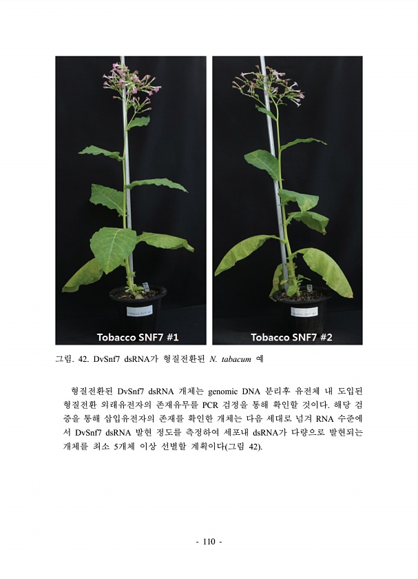 110 그림. 42. DvSnf7 dsRNA가 형질전환된 N. tabacum 예 형질전환된 DvSnf7 dsRNA 개체는 genomic DNA 분리후 유전체 내 도입된 형질전환 외래유전자의 존재유무를 PCR 검정을 통해 확인할 것이다. 해당 검 증을 통해 삽입유전자의 존재를 확인한 개체는 다음 세대로 넘겨 RNA 수준에 서 DvSnf7 dsRNA 발현 정도를 측정하여 세포내 dsRNA가 다량으로 발현되는 개체를 최소 5개체 이상 선별할 계획이다 그림 42