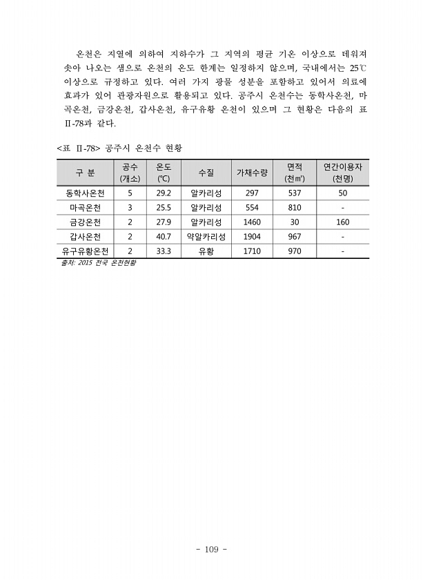 109 온천은 지열에 의하여 지하수가 그 지역의 평균 기온 이상으로 데워져 솟아 나오는 샘으로 온천의 온도 한계는 일정하지 않으며 국내에서는 이상으로 규정하고 있다 여러 가지 광물 성분을 포함하고 있어서 의료에 효과가 있어 관광자원으로 활용되고 있다 공주시 온천수는 동학사온천 마 곡온천 금강온천 갑사온천 유구유황 온천이 있으며 그 현황은 다음의 표 과 같다 구 분 공수 개소 온도 ℃ 수질 가채수량 면적 천㎡ 연간이용자 천명 동학사온천 5 29.2 알카리성 297 537 50 마곡온천 3 25.5 알카리성 554 810 금강온천 2 27.9 알카리성 1460 30 160 갑사온천 2 40.7 약알카리성 1904 967 유구유황온천 2 33.3 유황 1710 970 출처2015 전국 온천현황 표 공주시 온천수현...