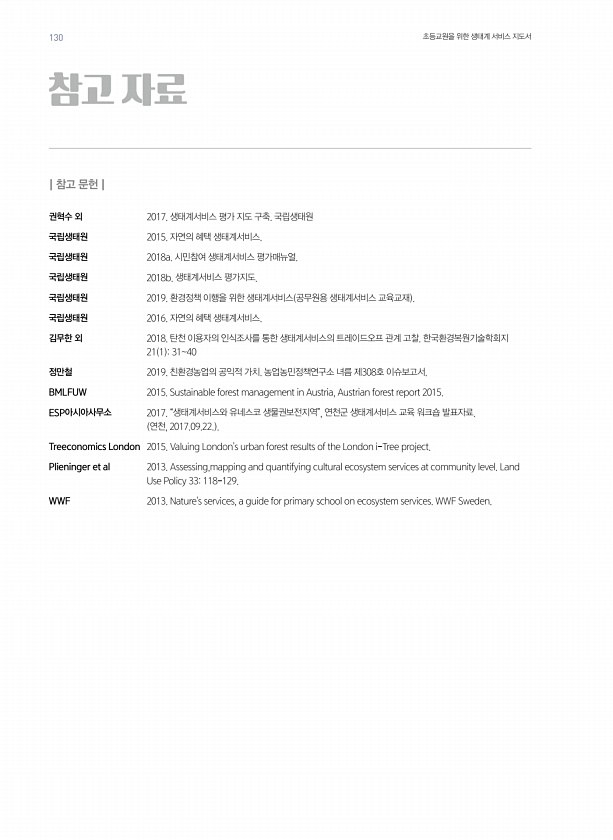 참고 자료 | 참고 문헌 | 권혁수 외 2017. 생태계서비스 평가 지도 구축. 국립생태원 국립생태원 2015. 자연의 혜택 생태계서비스. 국립생태원 2018a. 시민참여 생태계서비스 평가매뉴얼. 국립생태원 2018b. 생태계서비스 평가지도. 국립생태원 2019. 환경정책 이행을 위한 생태계서비스 공무원용 생태계서비스 교육교재 국립생태원 2016. 자연의 혜택 생태계서비스. 김무한 외 2018. 탄천 이용자의 인식조사를 통한 생태계서비스의 트레이드오프 관계 고찰. 한국환경복원기술학회지 21 1 3140 정만철 2019. 친환경농업의 공익적 가치. 농업농민정책연구소 녀름 제308호 이슈보고서. BMLFUW 2015. Sustainable forest management in Austria, Austrian f...