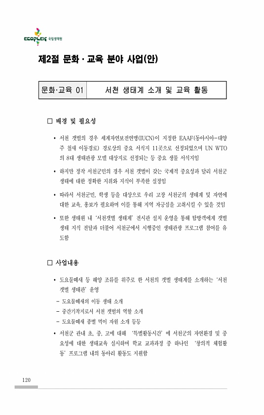 120 제2절 문화·교육 분야 사업 안 문화·교육 01 서천 생태계 소개 및 교육 활동 □ 배경 및 필요성 ? 서천 갯벌의 경우 세계자연보전연맹 IUCN 이 지정한 EAAF 동아시아-대양 주 철새 이동경로 경로상의 중요 서식지 11곳으로 선정되었으며 UN WTO 의 8대 생태관광 모델 대상지로 선정되는 등 중요 생물 서식지임 ? 하지만 정작 서천군민의 경우 서천 갯벌이 갖는 국제적 중요성과 달리 서천군 생태에 대한 정확한 지위와 지식이 부족한 실정임 ? 따라서 서천군민, 학생 등을 대상으로 우리 고장 서천군의 생태계 및 자연에 대한 교육, 홍보가 필요하며 이를 통해 지역 자긍심을 고취시킬 수 있을 것임 ? 또한 생태원 내‘서천갯벌 생태계’전시관 설치 운영을 통해 탐방객에게 갯벌 생태 지식 전달과 더불어 서천...