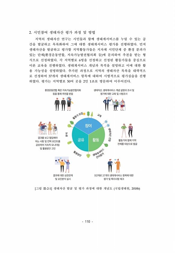 110 2. 시민참여 생태자산 평가 과정 및 방법 지역의 생태자산 연구는 시민들과 함께 생태계서비스를 누릴 수 있는 공 간을 발굴하고 목록화하여 그에 대한 생태계서비스 평가를 진행하였다. 먼저 생태자산을 발굴하고 평가할 지역활동가들은 지자체 시민단체 중 환경 분과가 있는 단체 환경운동연합, 지속가능발전협의회 등 에 문의하여 추천을 받는 형 식으로 선정하였다. 각 지역별로 6명을 선정하고 선정된 활동가들을 중심으로 이론 교육을 진행하였다. 생태계서비스 개념과 목적을 설명하고 이에 대한 활 용 가능성을 설명하였다. 추가된 과정으로 지역의 생태자산 목록을 대략적으 로 선정하여 37개의 생태계서비스 항목에 대하여 시범적으로 평가실습을 진행 하였다. 평가는 지역별로 50여 곳을 2인 1조로 방문하여 이루어진다. [그...