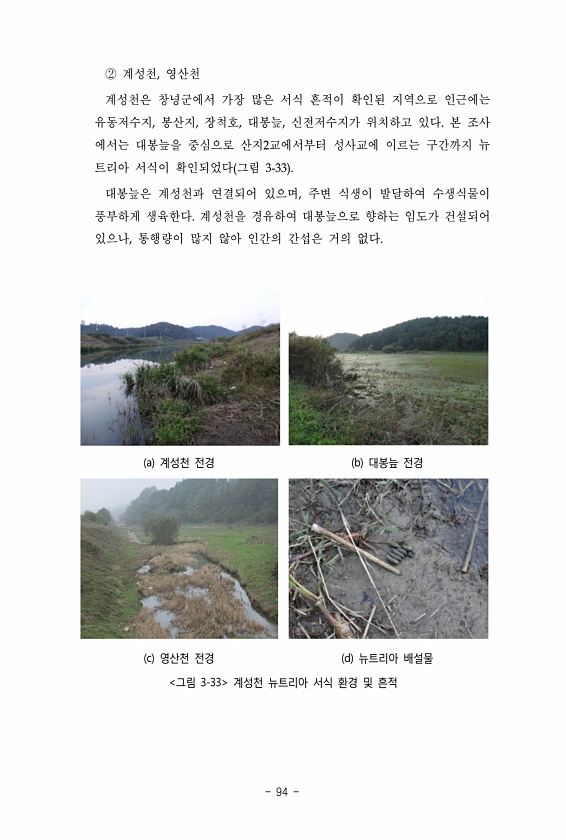 ② 계성천, 영산천 계성천은 창녕군에서 가장 많은 서식 흔적이 확인된 지역으로 인근에는 유동저수지, 봉산지, 장척호, 대봉늪, 신전저수지가 위치하고 있다. 본 조사 에서는 대봉늪을 중심으로 산지2교에서부터 성사교에 이르는 구간까지 뉴 트리아 서식이 확인되었다 그림 3-33 대봉늪은 계성천과 연결되어 있으며, 주변 식생이 발달하여 수생식물이 풍부하게 생육한다. 계성천을 경유하여 대봉늪으로 향하는 임도가 건설되어 있으나, 통행량이 많지 않아 인간의 간섭은 거의 없다. ? ? ? ? ?? ? ? ? ? ? ??