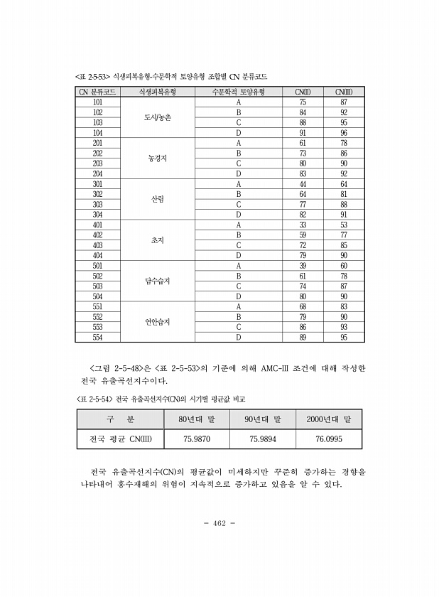 462 CN 분류코드 식생피복유형 수문학적 토양유형 CN II CN III 101 도시/농촌 A 75 87 102 B 84 92 103 C 88 95 104 D 91 96 201 농경지 A 61 78 202 B 73 86 203 C 80 90 204 D 83 92 301 산림 A 44 64 302 B 64 81 303 C 77 88 304 D 82 91 401 초지 A 33 53 402 B 59 77 403 C 72 85 404 D 79 90 501 담수습지 A 39 60 502 B 61 78 503 C 74 87 504 D 80 90 551 연안습지 A 68 83 552 B 79 90 553 C 86 93 554 D 89 95 표 2-5-53 식생피복유형-수문학적 토양유형 조합별 CN 분류코드 그림 2-5...