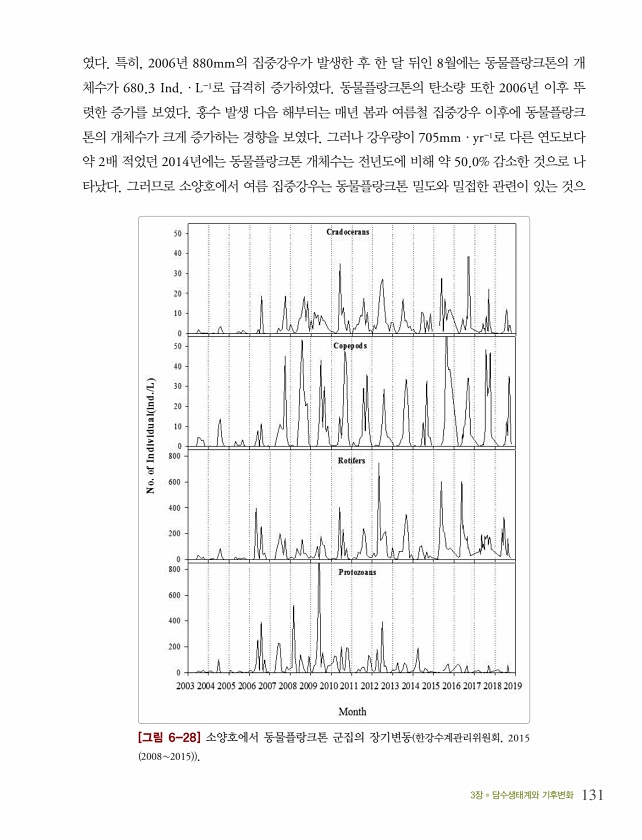 3장 담수생태계와 기후변화 131 였다. 특히, 2006년 880mm의 집중강우가 발생한 후 한 달 뒤인 8월에는 동물플랑크톤의 개 체수가 680.3 Ind.·L-1로 급격히 증가하였다. 동물플랑크톤의 탄소량 또한 2006년 이후 뚜 렷한 증가를 보였다. 홍수 발생 다음 해부터는 매년 봄과 여름철 집중강우 이후에 동물플랑크 톤의 개체수가 크게 증가하는 경향을 보였다. 그러나 강우량이 705mm·yr-1로 다른 연도보다 약 2배 적었던 2014년에는 동물플랑크톤 개체수는 전년도에 비해 약 50.0% 감소한 것으로 나 타났다. 그러므로 소양호에서 여름 집중강우는 동물플랑크톤 밀도와 밀접한 관련이 있는 것으 [그림 6-28] 소양호에서 동물플랑크톤 군집의 장기변동 한강수계관리위원회, 2015 20082015