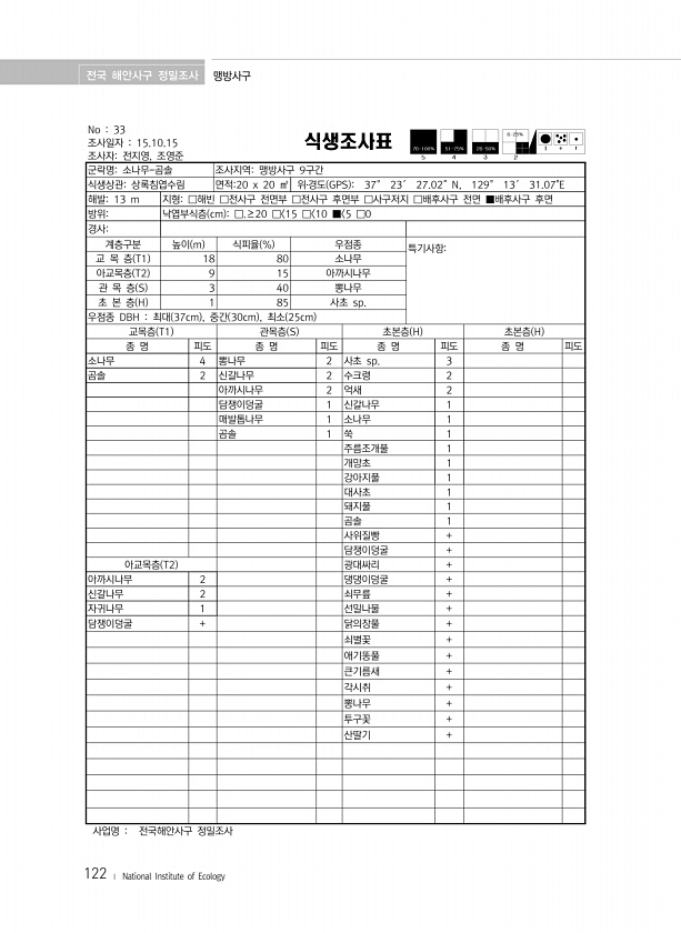 전국 해안사구 정밀조사 맹방사구 122 ? National Institute of Ecology No 33 조사일자 15.10.15 조사자전지영, 조영준 식생조사표 군락명소나무-곰솔 조사지역맹방사구 9구간 식생상관상록침엽수림 면적20 x 20 ㎡ 위?경도 GPS 37° 23′ 27.02″N, 129° 13′ 31.07E 해발13 m 지형□해빈 □전사구 전면부 □전사구 후면부 □사구저지 □배후사구 전면 ■배후사구 후면 방위낙엽부식층 cm □.≥20 □ 15 □ 10 ■ 5 □0 경사계층구분 높이 m 식피율 % 우점종 특기사항교 목 층 T1 18 80 소나무 아교목층 T2 9 15 아까시나무 관 목 층 S 3 40 뽕나무 초 본 층 H 1 85 사초 sp. 우점종 DBH 최대 37cm , 중간 30cm , 최소...