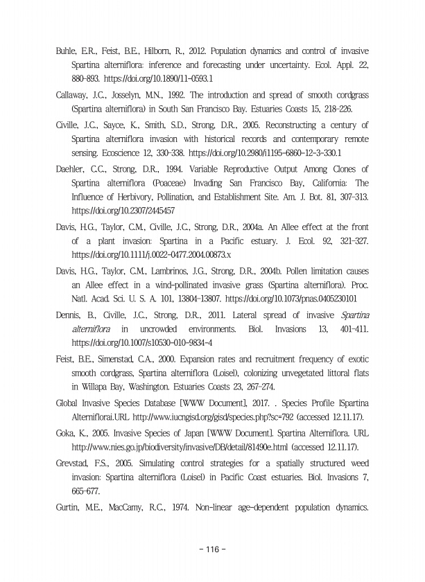 116 Buhle, E.R., Feist, B.E., Hilborn, R., 2012. Population dynamics and control of invasive Spartina alterniflorainference and forecasting under uncertainty. Ecol. Appl. 22, 880?893. https//doi.org/10.1890/11-0593.1 Callaway, J.C., Josselyn, M.N., 1992. The introduction and spread of smooth cordgrass Spartina alterniflora in South San Francisco Bay. Estuaries Coasts 15, 218?226. Civille, J.C., Sa...