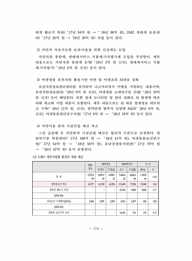 770 2016 결산 2017예산 2018예산안 증 감 본예산 추경 A 요구 조정 B B-A % 총 계 3,270,4 08 4,859,9 49 4,998,1 34 5,404,4 02 4,668,2 68 △329,8 66 △6.6 생태계보전·복원 63,717 61,330 62,254 113,600 77,294 15,040 24.2 생태계 훼손지 복원 23,724 9,800 9,800 순증 1832-304 자연보전 국제협력 ODA 2,208 2,005 2,005 2,451 2,407 402 20.0 1832-333 생태계 보전지역 관리 14,356 176 176 순증 표 3-86 세부사업별 환경부 세출 예산 태계 훼손지 복원 ‘17년 94억 원 → ’18년 98억 원 , DMZ 생태계 보전?관 리 ‘17년 26...