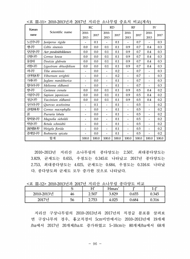 96 표 Ⅲ-11 2010-2013년과 2017년 지리산 소나무림 중요치 비교 계속 Korean name Scientific name RC RD RF IV 2010- 2013 2017 2010- 2013 2017 2010- 2013 2017 2010- 2013 2017 노간주나무 Juniperus rigida 0.1 0.1 0.7 0.3 팽나무 Celtis sinensis 0.0 0.0 0.1 0.1 0.9 0.7 0.4 0.3 당단풍나무 Acer pseudosieboldianum 0.0 0.0 0.1 0.1 0.9 0.7 0.4 0.3 산딸나무 Cornus kousa 0.0 0.0 0.1 0.1 0.9 0.7 0.4 0.3 물참대 Deutzia glabrata 0.0 0.0 0.1 0.1 0.9 0.7 0...