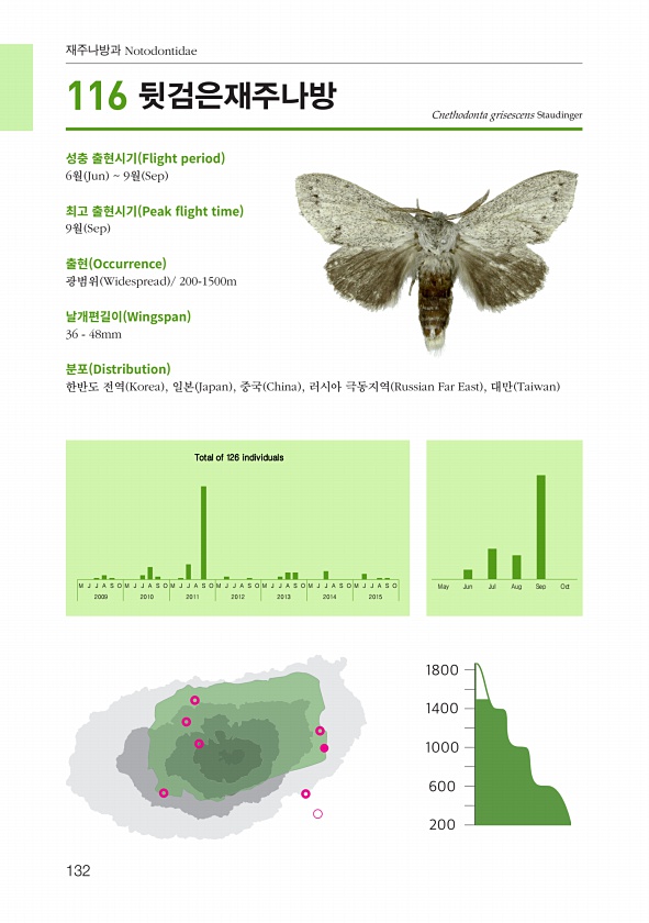 132 재주나방과 Notodontidae 성충 출현시기 Flight period 6월 Jun 9월 Sep 최고 출현시기 Peak fight time 9월 Sep 출현 Occurrence 광범위 Widespread 200-1500m 날개편길이 Wingspan 36 48mm 분포 Distribution 한반도 전역 Korea , 일본 Japan , 중국 China , 러시아 극동지역 Russian Far East , 대만 Taiwan Cnethodonta grisescens Staudinger M J J A S O M J J A S O M J J A S O M J J A S O M J J A S O M J J A S O M J J A S O May Jun Jul Aug Sep Oct 2009 2010 2011 ...