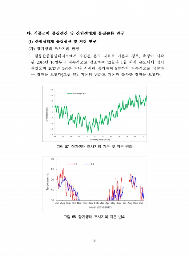 다. 식물군락 물질생산 및 산림생태계 물질순환 연구 1 산림생태계 물질생산 및 저장 연구 가 장기생태 조사지의 환경 점봉산중점생태지소에서 수집된 온도 자료로 기온의 경우, 측정이 시작 된 2016년 10월부터 지속적으로 감소하여 12월과 1월 최저 온도대에 접어 들었으며 2017년 1워를 지나 서서히 증가하여 8월까지 지속적으로 상승하 는 경향을 보였다 그림 57 지온의 변화도 기온과 유사한 경향을 보였다. 그림 57. 장기생태 조사지의 기온 및 지온 변화 그림 58. 장기생태 조사지의 지온 변화 98