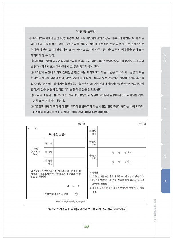 133 제5차 전국자연환경조사 지침 「자연환경보전법」 제33조 타인토지에의?출입?등 ① 환경부장관?또는?지방자치단체의?장은?제30조의?자연환경조사?또는 제31조의?규정에?의한?정밀ㆍ보완조사를?위하여?필요한?경우에는?소속?공무원?또는?조사원으로 하여금?타인의?토지에?출입하여?조사하거나?그?토지의?나무ㆍ흙ㆍ돌?그?밖의?장애물을?변경?또는 제거하게?할?수?있다. ② 제1항의?규정에?의하여?타인의?토지에?출입하고자?하는?사람은?출입할?날의 3일?전까지?그?토지의 소유자ㆍ점유자?또는?관리인에게?그?뜻을?통지하여야?한다. ③ 제1항의?규정에?의하여?장애물을?변경?또는?제거하고자?하는?사람은?그?소유자ㆍ점유자?또는 관리인의?동의를?얻어야?한다. 다만, 장애물의?소유자ㆍ점유자?또는?관리인이?현장에?없거나?주소를 알?수?없...