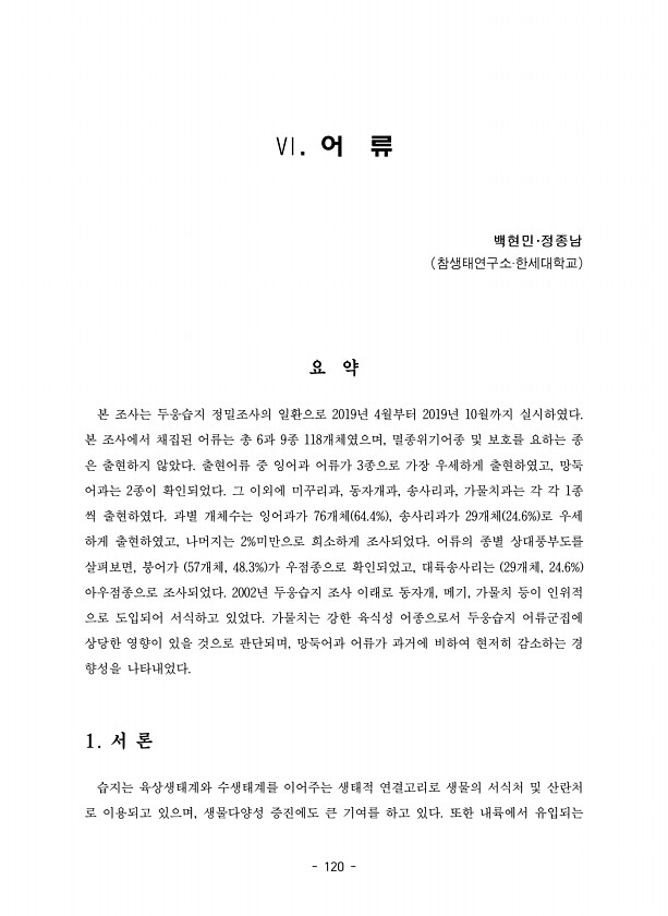 120 Ⅵ. 어 류 백현민·정종남 참생태연구소·한세대학교 요 약 본 조사는 두웅습지 정밀조사의 일환으로 2019년 4월부터 2019년 10월까지 실시하였다. 본 조사에서 채집된 어류는 총 6과 9종 118개체였으며, 멸종위기어종 및 보호를 요하는 종 은 출현하지 않았다. 출현어류 중 잉어과 어류가 3종으로 가장 우세하게 출현하였고, 망둑 어과는 2종이 확인되었다. 그 이외에 미꾸리과, 동자개과, 송사리과, 가물치과는 각 각 1종 씩 출현하였다. 과별 개체수는 잉어과가 76개체 64.4% , 송사리과가 29개체 24.6% 로 우세 하게 출현하였고, 나머지는 2%미만으로 희소하게 조사되었다. 어류의 종별 상대풍부도를 살펴보면, 붕어가 57개체, 48.3% 가 우점종으로 확인되었고, 대륙송사리는 29개체, 24....