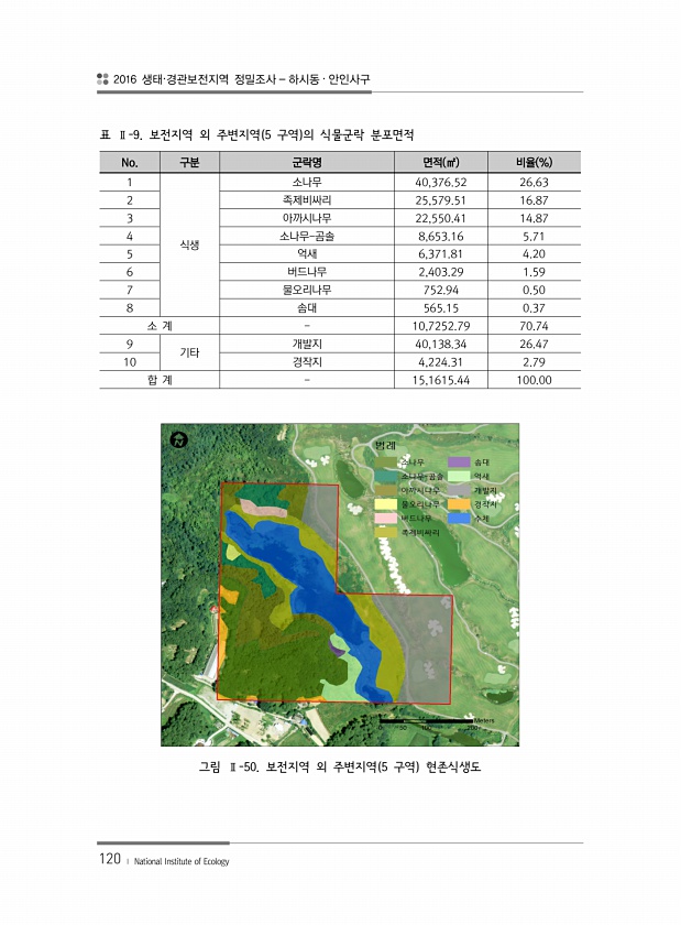 2016 생태·경관보전지역 정밀조사 하시동 · 안인사구 120 ? National Institute of Ecology No. 구분 군락명 면적 ㎡ 비율 % 1 식생 소나무 40,376.52 26.63 2 족제비싸리 25,579.51 16.87 3 아까시나무 22,550.41 14.87 4 소나무-곰솔 8,653.16 5.71 5 억새 6,371.81 4.20 6 버드나무 2,403.29 1.59 7 물오리나무 752.94 0.50 8 솜대 565.15 0.37 소 계 10,7252.79 70.74 9 기타 개발지 40,138.34 26.47 10 경작지 4,224.31 2.79 합 계 15,1615.44 100.00 표 Ⅱ-9. 보전지역 외 주변지역 5 구역 의 식물군락 분포면적 그림 Ⅱ-50. 보전지역 ...