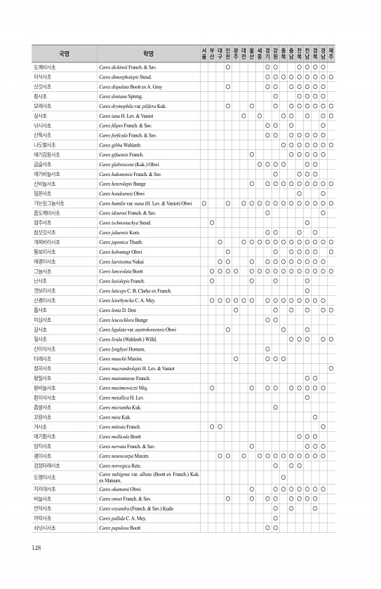 128 도깨비사초 Carex dickinsii Franch. & Sav. ○ ○ ○ ○ ○ ○ ○ 이삭사초 Carex dimorpholepis Steud. ○ ○ ○ ○ ○ ○ ○ ○ ○ 삿갓사초 Carex dispalata Boott ex A. Gray ○ ○ ○ ○ ○ ○ ○ ○ 흰사초 Carex doniana Spreng. ○ ○ ○ ○ ○ 모래사초 Carex drymophila var. pilifera Kuk. ○ ○ ○ ○ ○ ○ ○ ○ ○ 실사초 Carex iana H. Lev. & Vaniot ○ ○ ○ ○ ○ ○ ○ 낚시사초 Carex flipes Franch. & Sav. ○ ○ ○ ○ 산뚝사초 Carex forfcula Franch. & Sav. ○ ○ ○ ○ ○ ○ ○ 나도별사초 Care...