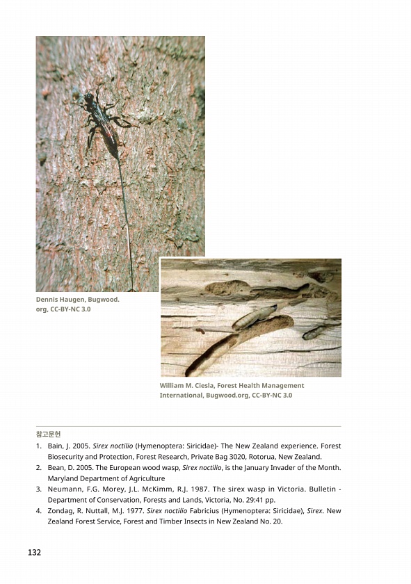 132 참고문헌 1. Bain, J. 2005. Sirex noctilio HymenopteraSiricidae The New Zealand experience. Forest Biosecurity and Protection, Forest Research, Private Bag 3020, Rotorua, New Zealand. 2. Bean, D. 2005. The European wood wasp, Sirex noctilio, is the January Invader of the Month. Maryland Department of Agriculture 3. Neumann, F.G. Morey, J.L. McKimm, R.J. 1987. The sirex wasp in Victoria. Bulletin De...