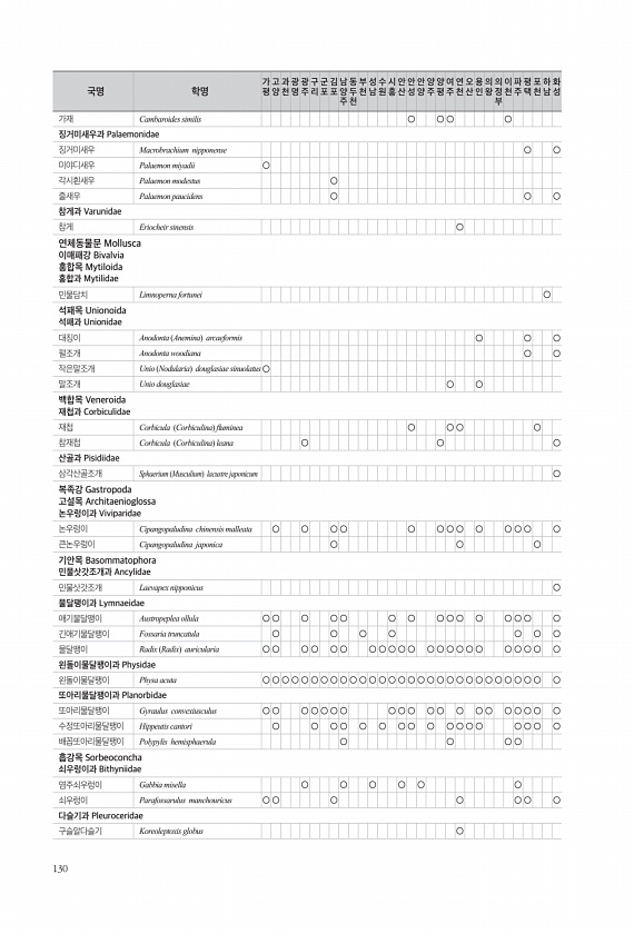 130 가재 Cambaroides similis ○ ○○ ○ 징거미새우과 Palaemonidae 징거미새우 Macrobrachium nipponense ○ ○ 미야디새우 Palaemon miyadii ○ 각시흰새우 Palaemon modestus ○ 줄새우 Palaemon paucidens ○ ○ ○ 참게과 Varunidae 참게 Eriocheir sinensis ○ 연체동물문 Mollusca 이매패강 Bivalvia 홍합목 Mytiloida 홍합과 Mytilidae 민물담치 Limnoperna fortunei ○ 석패목 Unionoida 석패과 Unionidae 대칭이 Anodonta Anemina arcaeformis ○ ○ ○ 펄조개 Anodonta woodiana ○ ○ 작은말조개 Unio Nodul...