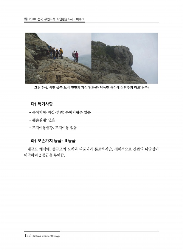2018 전국 무인도서 자연환경조사 여수 1 122 ? National Institute of Ecology 그림 7-4. 서안 중부 노치 전면의 파식대 좌 와 남동단 해식애 상단부의 타포니 우 특이지형·지질·경관특이지형은 없음 훼손실태없음 토지이용현황토지이용 없음 대규모 해식애, 중규모의 노치와 타포니가 분포하지만, 전체적으로 경관의 다양성이 미약하여 2 등급을부여함.