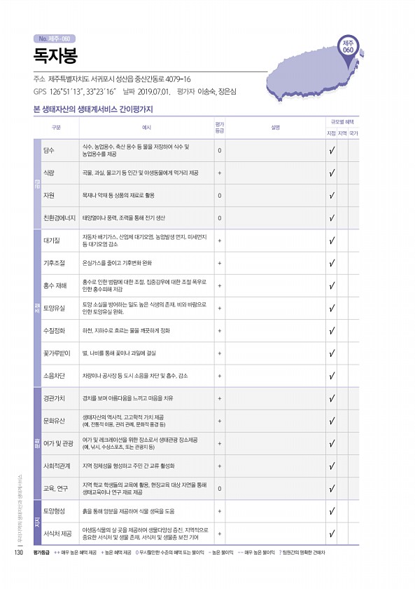No. 제주- 제주 060 본 생태자산의 생태계서비스 간이평가지 구분 예시 평가 등급 설명 규모별 혜택 지점 지역 국가 공급 담수 식수, 농업용수, 축산 용수 등 물을 저장하여 식수 및 농업용수를 제공 0 √ 식량 곡물, 과실, 물고기 등 인간 및 야생동물에게 먹거리 제공 + √ 자원 목재나 약재 등 상품의 재료로 활용 0 √ 친환경에너지 태양열이나 풍력, 조력을 통해 전기 생산 0 √ 조절 대기질 자동차 배기가스, 산업체 대기오염, 농업발생 먼지, 미세먼지 등 대기오염 감소 + √ 기후조절 온실가스를 줄이고 기후변화 완화 + √ 홍수 재해 홍수로 인한 범람에 대한 조절, 집중강우에 대한 조절 폭우로 인한 홍수피해 저감 + √ 토양유실 토양 소실을 방어하는 밀도 높은 식생의 존재, 비와 바람으로 인한 토양유...