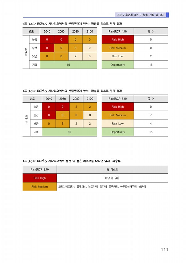 3장 기후변화 리스크 항목 선정 및 평가 111 Risk RCP 8.5 종 리스트 Risk High 해당 종 없음 Risk Medium 꼬리치레도롱뇽, 물두꺼비, 북도마뱀, 장지뱀, 중국자라, 아무르산개구리, 남생이 표 3.51 RCP8.5 시나리오에서 중간 및 높은 리스크를 나타낸 양서?파충류 년도 2040 2060 2080 2100 Risk RCP 8.5 종 수 취약성 높음 0 0 2 2 Risk High 0 중간 0 0 0 0 Risk Medium 7 낮음 0 3 2 2 Risk Low 4 기회 15 Opportunity 15 표 3.50 RCP8.5 시나리오에서의 산림생태계 양서?파충류 리스크 평가 결과 년도 2040 2060 2080 2100 Risk RCP 4.5 종 수 취약성 높음 0 0 0 0...