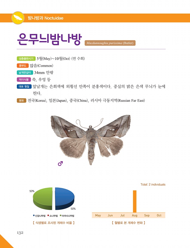 132 밤나방과 Noctuidae 성충출현시기 5월 May 10월 Oct 연 수회 풍부도 많음 Common 날개편길이 34mm 안팎 먹이식물 쑥, 우엉 등 대표 형질 앞날개는 은회색에 외횡선 안쪽이 분홍색이다. 중실의 밝은 은색 무늬가 눈에 띈다. 분포 전국 Korea , 일본 Japan , 중국 China , 러시아 극동지역 Russian Far East 은무늬밤나방 Macdunnoughia purissima Butler 【 월별로 본 개체수 변화 】 Total2 individuals May Jun Jul Aug Sep Oct 【 식생별로 조사된 개체수 비율 】 50% 신갈나무림 소나무림 아까시나무림50%