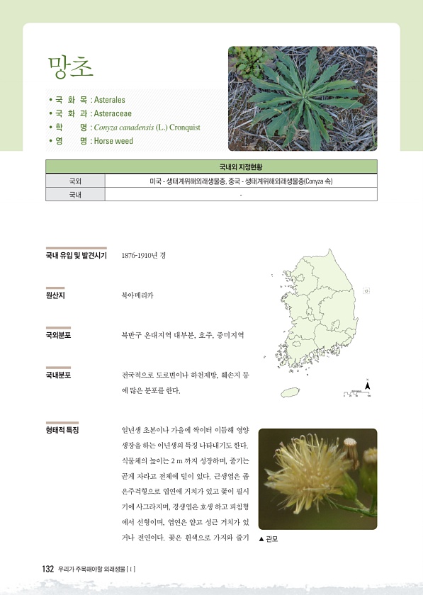 132 우리가 주목해야할 외래생물 [Ⅰ] 국내 유입 및 발견시기 1876-1910년 경 원산지 북아메리카 국외분포 북반구 온대지역 대부분, 호주, 중미지역 국내분포 전국적으로 도로변이나 하천제방, 훼손지 등 에 많은 분포를 한다. 형태적 특징 일년생 초본이나 가을에 싹이터 이듬해 영양 생장을 하는 이년생의 특징 나타내기도 한다. 식물체의 높이는 2 m 까지 성장하며, 줄기는 곧게 자라고 전체에 털이 있다. 근생엽은 좁 은주걱형으로 엽연에 거치가 있고 꽃이 필시 기에 사그라지며, 경생엽은 호생 하고 피침형 에서 선형이며, 엽연은 얕고 성근 거치가 있 거나 전연이다. 꽃은 흰색으로 가지와 줄기 ? 국 화 목 Asterales ? 국 화 과 Asteraceae ? 학 명 Conyza canadensis L. Cr...