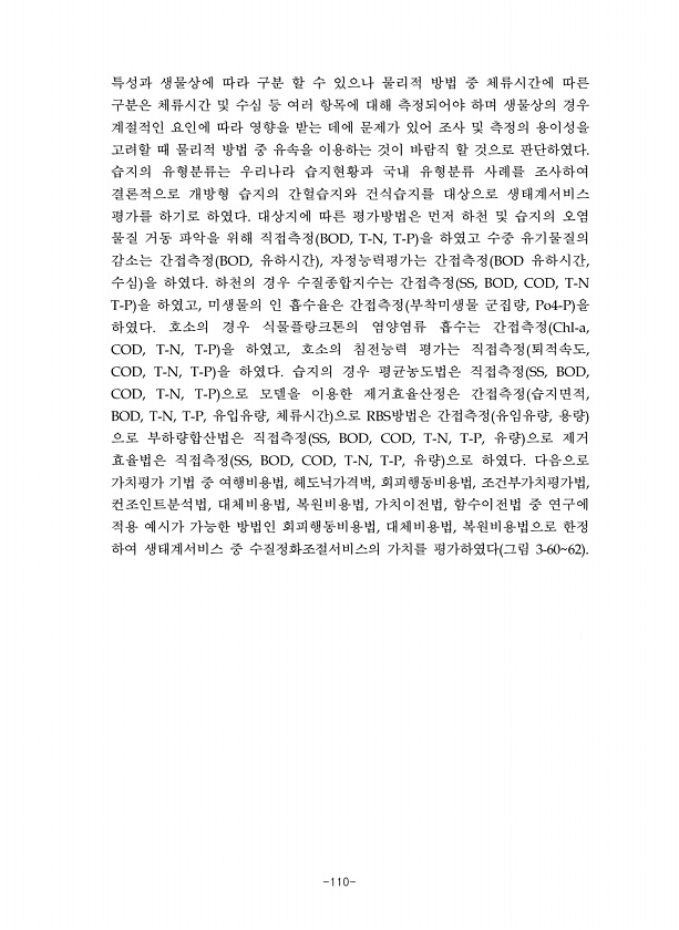 -110- 특성과 생물상에 따라 구분 할 수 있으나 물리적 방법 중 체류시간에 따른 구분은 체류시간 및 수심 등 여러 항목에 대해 측정되어야 하며 생물상의 경우 계절적인 요인에 따라 영향을 받는 데에 문제가 있어 조사 및 측정의 용이성을 고려할 때 물리적 방법 중 유속을 이용하는 것이 바람직 할 것으로 판단하였다 습지의 유형분류는 우리나라 습지현황과 국내 유형분류 사례를 조사하여 결론적으로 개방형 습지의 간헐습지와 건식습지를 대상으로 생태계서비스 평가를 하기로 하였다 대상지에 따른 평가방법은 먼저 하천 및 습지의 오염 물질 거동 파악을 위해 직접측정 을 하였고 수중 유기물질의 감소는 간접측정 유하시간 자정능력평가는 간접측정 유하시간 수심 을 하였다 하천의 경우 수질종합지수는 간접측정 을 하였고 미생물의 인 ...