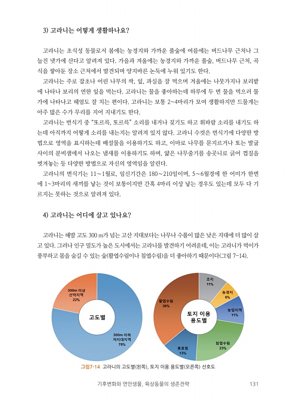 기후변화와 연안생물, 육상동물의 생존전략 131 3 고라니는 어떻게 생활하나요? 고라니는 초식성 동물로서 봄에는 농경지와 가까운 풀숲에 여름에는 버드나무 근처나 그 늘진 냇가에 산다고 알려져 있다. 가을과 겨울에는 농경지와 가까운 풀숲, 버드나무 근처, 곡 식을 쌓아둔 장소 근처에서 발견되며 양지바른 논둑에 누워 있기도 한다. 고라니는 주로 잡초나 어린 나무의 싹, 잎, 과실을 잘 먹으며 겨울에는 나뭇가지나 보리밭 에 나타나 보리의 연한 잎을 먹는다. 고라니는 물을 좋아하는데 하루에 두 번 물을 먹으러 물 가에 나타나고 헤엄도 잘 치는 편이다. 고라니는 보통 24마리가 모여 생활하지만 드물게는 아주 많은 수가 무리를 지어 지내기도 한다. 고라니는 번식기 중 “또르륵, 또르륵” 소리를 내거나 짖기도 하고 휘파...