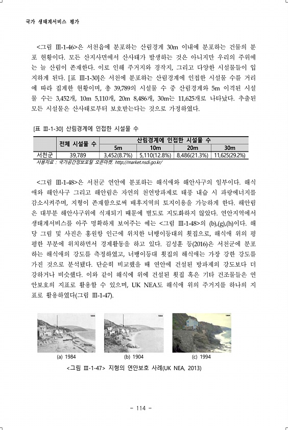국가 생태계서비스 평가 114 그림 Ⅲ-1-46 은 서천읍에 분포하는 산림경계 30m 이내에 분포하는 건물의 분 포 현황이다. 모든 산지사면에서 산사태가 발생하는 것은 아니지만 우리의 주위에 는 늘 산림이 존재한다. 이로 인해 주거지와 경작지, 그리고 다양한 시설물들이 입 지하게 된다. [표 Ⅲ-1-30]은 서천에 분포하는 산림경계에 인접한 시설물 수를 거리 에 따라 집계한 현황이며, 총 39,789의 시설물 수 중 산림경계와 5m 이격된 시설 물 수는 3,452개, 10m 5,110개, 20m 8,486개, 30m는 11,625개로 나타났다. 추출된 모든 시설물은 산사태로부터 보호받는다는 것으로 가정하였다. 전체 시설물 수 산림경계에 인접한 시설물 수 5m 10m 20m 30m 서천군 39,789 3,45...