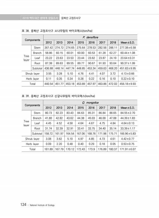 2018 백두대간 생태계 정밀조사 응복산 고정조사구 124 ? National Institute of Ecology Components P. densiflora 2012 2013 2014 2015 2016 2017 2018 Mean±S.D. Tree layer Stem 267.42 274.72 274.65 275.64 278.53 282.56 288.11 277.38±6.58 Branch 58.86 60.15 60.01 60.00 60.53 61.28 62.27 60.44±1.08 Leaf 23.22 23.63 23.53 23.44 23.62 23.87 24.19 23.64±0.31 Root 87.38 89.63 89.55 89.77 90.67 91.93 93.64 90.37±1.99 Subtotal 436...