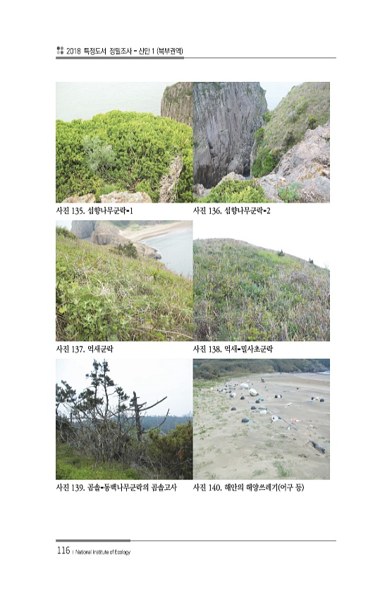 2018 특정도서 정밀조사 신안 1 북부권역 116 ? National Institute of Ecology 사진 135. 섬향나무군락-1 사진 136. 섬향나무군락-2 사진 137. 억새군락 사진 138. 억새-밀사초군락 사진 139. 곰솔-동백나무군락의 곰솔고사 사진 140. 해안의 해양쓰레기 어구 등