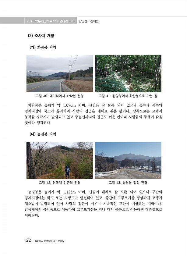 2018 백두대간보호지역 생태계 조사 삽당령 신배령 122 ? National Institute of Ecology 2 조사지 개황 가 화란봉 지역 그림 40. 대기리에서 바라본 전경 그림 41. 삽당령에서 화란봉으로 가는 길 화란봉은 높이가 약 1,070m 이며, 산림은 잘 보존 되어 있으나 동쪽과 서쪽의 경계지점에 국도가 통과하여 사람의 접근은 대체로 쉬운 편이다. 남쪽으로는 고랭지 농작물 경작지가 발달되고 있고 주능선까지의 접근도 쉬운 편이라 사람들의 통행이 잦을 것이라 생각된다. 나 능경봉 지역 그림 42. 닭목재 인근의 전경 그림 43. 능경봉 정상 전경 능경봉은 높이가 약 1,123m 이며, 산림이 대체로 잘 보존 되어 있으나 구간의 경계지점에는 국도 또는 지방도가 연결되어 있고, 중간에 고루포기...