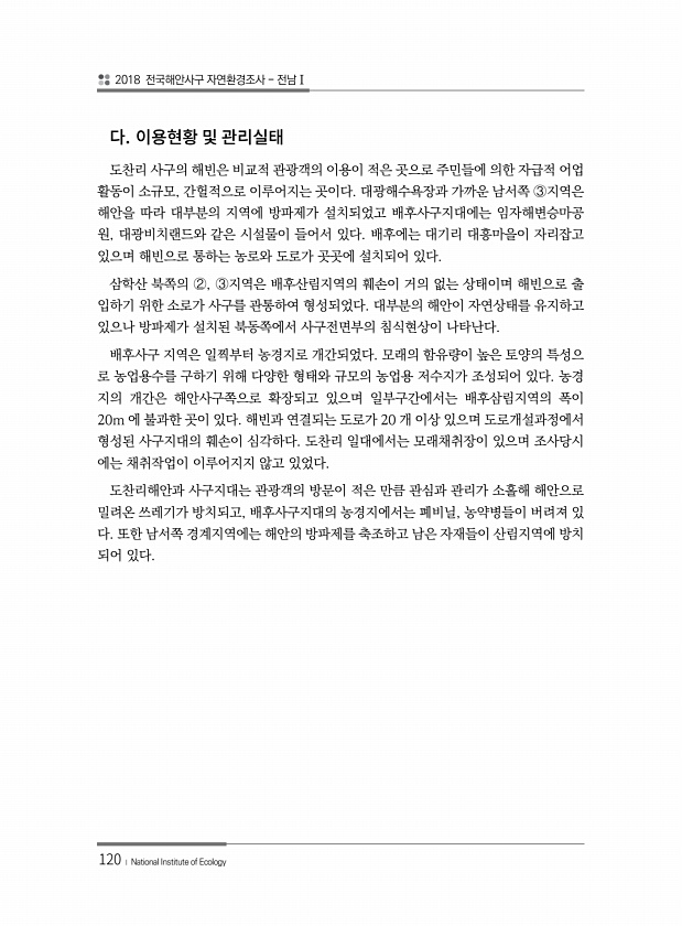 2018 전국해안사구 자연환경조사 전남Ⅰ 120 ? National Institute of Ecology 도찬리 사구의 해빈은 비교적 관광객의 이용이 적은 곳으로 주민들에 의한 자급적 어업 활동이 소규모, 간헐적으로 이루어지는 곳이다. 대광해수욕장과 가까운 남서쪽 ?지역은 해안을 따라 대부분의 지역에 방파제가 설치되었고 배후사구지대에는 임자해변승마공 원, 대광비치랜드와 같은 시설물이 들어서 있다. 배후에는 대기리 대흥마을이 자리잡고 있으며 해빈으로 통하는 농로와 도로가 곳곳에 설치되어 있다. 삼학산 북쪽의 ?, ?지역은 배후산림지역의 훼손이 거의 없는 상태이며 해빈으로 출 입하기 위한 소로가 사구를 관통하여 형성되었다. 대부분의 해안이 자연상태를 유지하고 있으나 방파제가 설치된 북동쪽에서 사구전면부의 침식현...