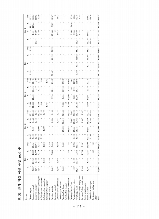 Species Site 1 Site 2 Site 3 Site 4 Site 5 L C R total L C R total L C R total L C R total L C R total Channa argus 8,097 4,284 12,381 5,356 5,356 1,193 1,193 11,515 11,515 Coreoperca herzi 3,207 10,965 1,389 15,561 5,655 5,121 6,168 16,944 24,040 12,458 10,696 47,194 4,541 11,964 16,505 Siniperca scherzeri 1,013 8,642 1,409 11,064 5,534 1,142 6,676 379 379 17,776 4,829 22,605 Acheilognathus cyano...