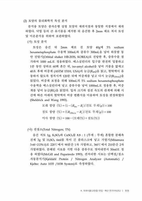 토양의 물리화학적 특성 분석 분석용 토양은 종자은행 실험 토양의 채취지점과 동일한 지점에서 채취 하였다 낙엽 등의 큰 유기물을 제거한 뒤 음건한 후 체로 쳐서 토성 및 이온분석을 위하여 보관하였다 가 토성 분석 토성은 음건 뒤 체로 친 토양 에 수용액 와 증류수 을 넣어 하룻밤 동 안 진탕기 로 진탕한 후 증류수를 첨 가하여 로 정용하였다 메스실린더의 입구를 완전히 밀봉하고 분 동안 상하로 회 흔든 뒤 을 넣어 거품을 없애고 초 후에 비중계 의 눈금 을 읽고 현탁액이 유 동하지 않도록 정치시켜 분 뒤에 비중계를 넣고 다시 눈금 을 읽었다 비중계 보정을 위해 의 수용액을 메스실린더에 넣고 증류수를 넣어 로 정용한 후 비중 계를 넣어 눈금 을 읽었다 입자 크기와 침전 속도의 관계에 의해 시 간에 따른 아래의 현...