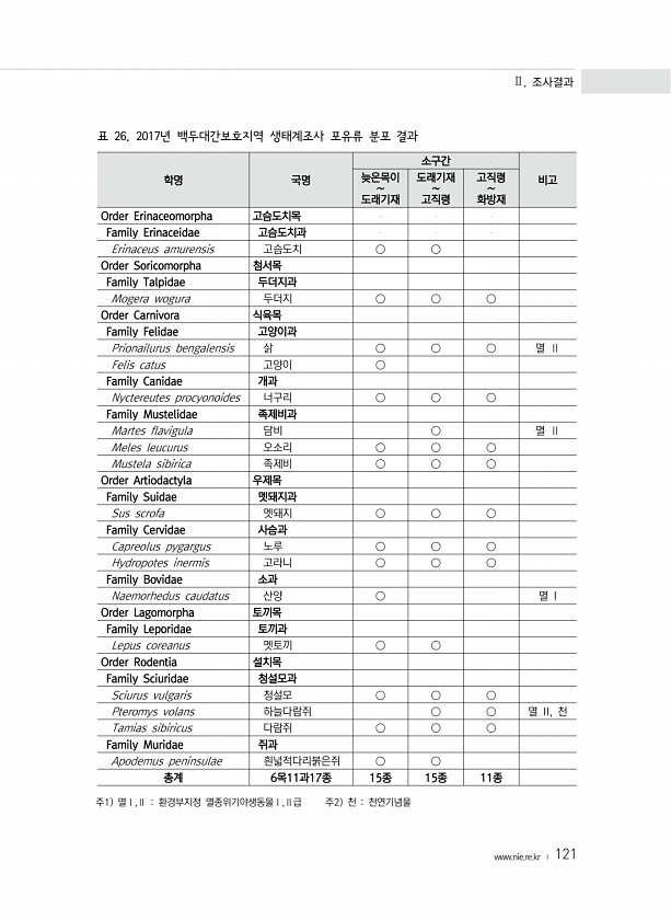 Ⅱ. 조사결과 www.nie.re.kr ? 121 학명 국명 소구간 늦은목이 비고 ∼ 도래기재 도래기재 ∼ 고직령 고직령 ∼ 화방재 Order Erinaceomorpha 고슴도치목 Family Erinaceidae 고슴도치과 Erinaceus amurensis 고슴도치 ○ ○ Order Soricomorpha 첨서목 Family Talpidae 두더지과 Mogera wogura 두더지 ○ ○ ○ Order Carnivora 식육목 Family Felidae 고양이과 Prionailurus bengalensis 삵 ○ ○ ○ 멸 Ⅱ Felis catus 고양이 ○ Family Canidae 개과 Nyctereutes procyonoides 너구리 ○ ○ ○ Family Mustelidae 족제비과 Martes...