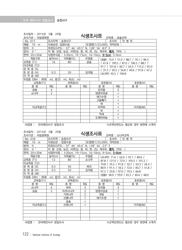 전국 해안사구 정밀조사 송정사구 122 ? National Institute of Ecology 조사일자 2015년 5월 29일 조사기관 국립생태원 식생조사표 군락명 곰솔군락 No. 017 조사지역 송정사구 조사자 민 병 미 해발10 m 식생상관 침엽수림 도엽명 1/25,000 , 격자번호 방위0 위경도 GPS 37°46′49.5″N, 128°56′8.9″E 경사0 ° 지 형산정, 능선, 사면 상, 중, 하, 凹, 凸 , 계곡부, 평지, 기타 면적20×20㎡ 낙엽부식층 ≥20cm, 19-15cm, 14-10cm, 9-5cm, 5-0cm 계층구분 높이 m 식피율 % 우점종 곰솔 75.0 51.0 88.7 74.1 84.5 41.8 100.5 81.0 106.5 88.7 97.7 101.8 82.7 43.3 1...