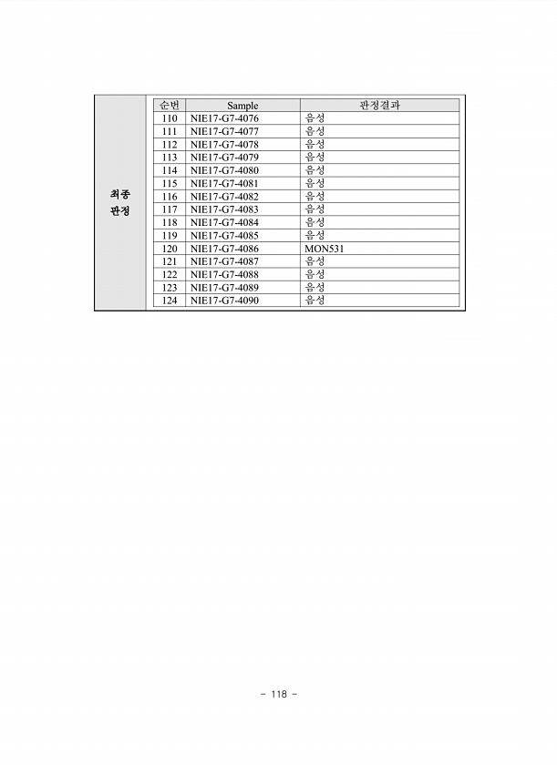 118 최종 판정 순번 Sample 판정결과 110 NIE17-G7-4076 음성 111 NIE17-G7-4077 음성 112 NIE17-G7-4078 음성 113 NIE17-G7-4079 음성 114 NIE17-G7-4080 음성 115 NIE17-G7-4081 음성 116 NIE17-G7-4082 음성 117 NIE17-G7-4083 음성 118 NIE17-G7-4084 음성 119 NIE17-G7-4085 음성 120 NIE17-G7-4086 MON531 121 NIE17-G7-4087 음성 122 NIE17-G7-4088 음성 123 NIE17-G7-4089 음성 124 NIE17-G7-4090음성